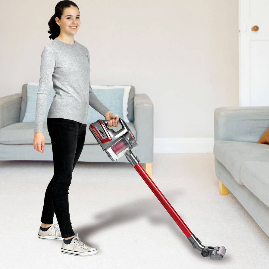 Make everyday cleaning effortless with this Powerful Cordless Stick Vacuum. The clever 2-in-1 design converts from stick to handheld in seconds – ideal for floors, furniture, stairs and car interiors. With 170W power and strong 12KPA suction, plus a 160° rotating turbo brush, crevice and dusting tools, it delivers fast, efficient results on every surface. The 22.2V rechargeable battery charges in 4.5 hours and runs up to 20 minutes. Lightweight at 2.5kg, with a 0.8L bagless dust container and HEPA filter, it’s practical cordless convenience in modern red and grey.