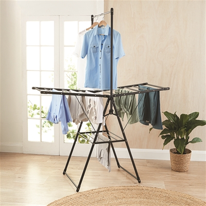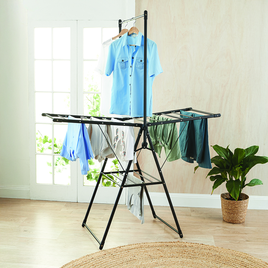 You can now dry or air everything from a silk blouse to sneakers thanks to this rack’s clever design. The top rod is perfect for coat hangers while the wings give you a choice of more hanging space or keeping delicate items in shape by lying them flat. You can also arrange smaller items and shoes at the base. Fully opened, it measures 180H x 145W x 60D cm and it folds down for easy storage.