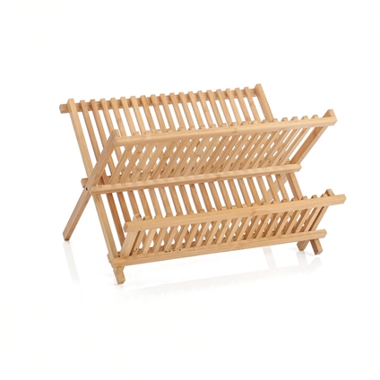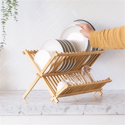 Bring natural style and simplicity to your kitchen with this beautifully crafted bamboo dish rack. The foldable X-shape frame offers strength and stability while remaining lightweight and easy to handle. Made from eco-friendly bamboo, it’s naturally moisture-resistant and quick-drying, making it a practical choice for daily use. The upper tier neatly holds up to 15 plates, while the lower tier provides generous space for bowls, cups, glasses and utensils. Folds flat for effortless storage – ideal for smaller kitchens, caravans or camping trips. Finished with a smooth surface for a clean, timeless look.