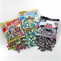Toffees & Chocolate Eclairs: Glucose Syrup, Sugar, Sweetened Condensed Milk (Whole Milk, Sugar) 19%, Vegetable Oil (Sustainable palm oil), Milk Chocolate ((Cocoa Solids 31.3% Min, Milk Solids 17% Min) Sugar, Cocoa Butter, Whole Milk Powder, Cocoa Mass, Anhydrous Milkfat (Milk), Emulsifier: Soya Lecithin, Natural Vanilla Flavouring), Dark Chocolate ((Cocoa Solids 70% Min) Cocoa Mass, Sugar, Fat-Reduced Cocoa Powder, Emulsifier: Soya Lecithin), White Chocolate (Sugar, Whole Milk Powder, Cocoa Butter, Emulsifier: Soya Lecithin, Natural Vanilla Flavouring), Concentrated Butter (Milk) 3%, Invert Sugar Syrup, Salt, Molasses, Emulsifier (Glyceryl Monostearate), Flavourings. Salted Caramel Toffees: Glucose Syrup, Sugar, Sweetened Condensed Milk (Whole Milk, Sugar) 19%, Vegetable Oil (Sustainable Palm, Palm Kernel), Concentrated Butter (Milk) 4%, Invert Sugar Syrup, Anglesey Sea Salt 1%, Salt, Natural Caramel Flavour, Molasses, Emulsifier: Soya (Glyceryl Monostearate, Lecithin), Vanilla Flavouring. ALLERGENS: Milk, Soy. May contain traces of nuts. Not suitable for consumers with nut allergies or children under 36 months. |