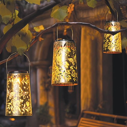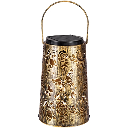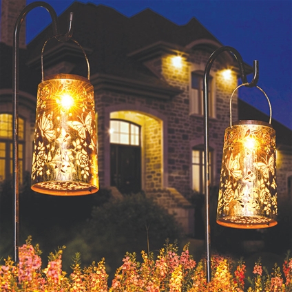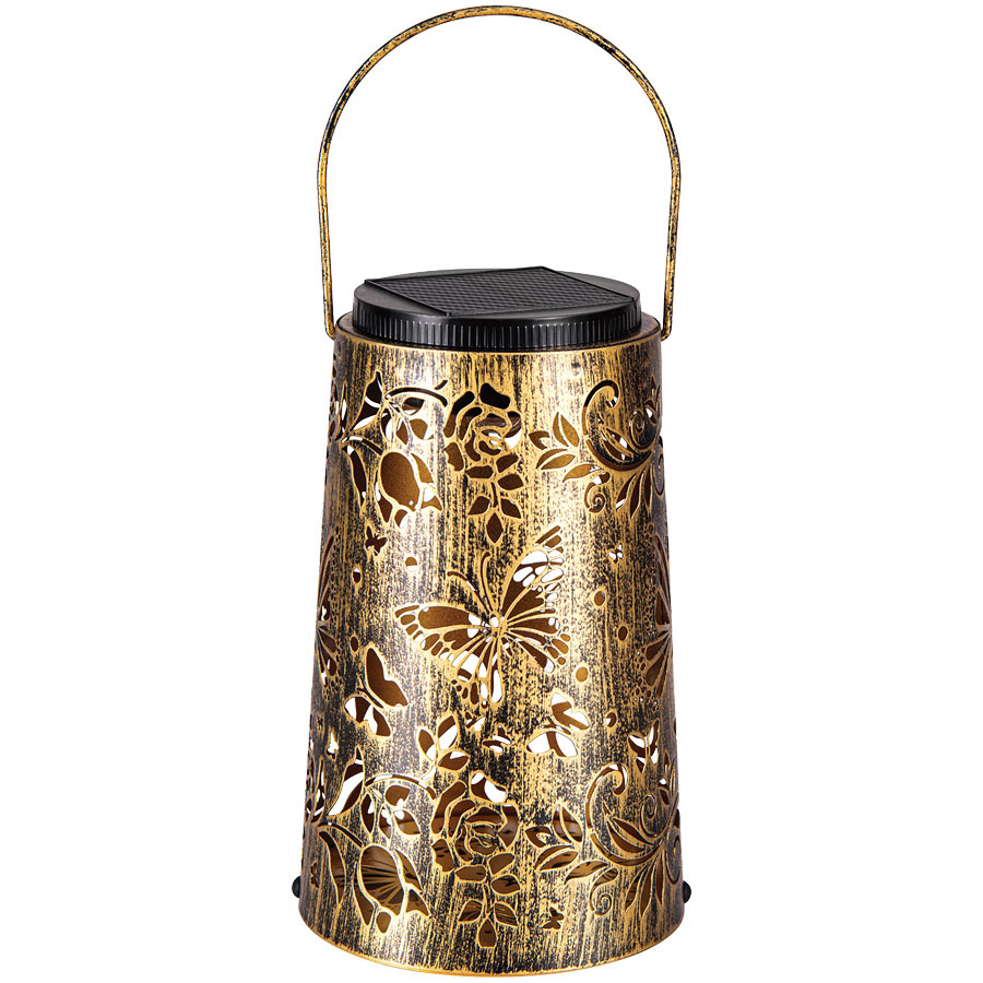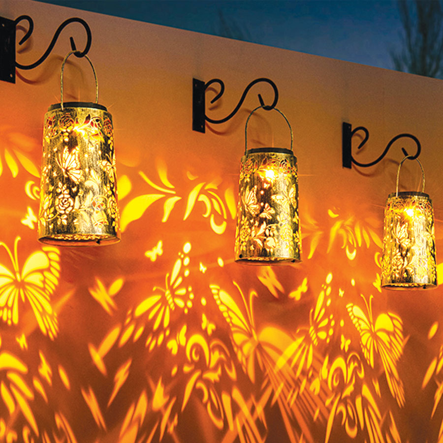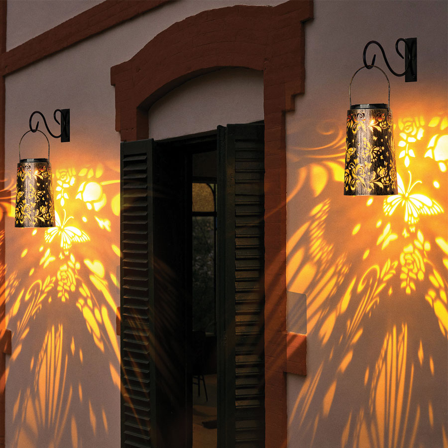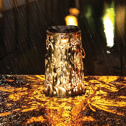 Add elegance and ambience to outdoor spaces with the Solar Butterfly Lantern, beautifully crafted in a rich gold finish. Powered by solar energy, it charges during the day and automatically illuminates at night with no wiring required. As darkness falls, it projects enchanting butterfly and botanical light patterns, creating a magical glow. Easily switch between warm and cool light effects to suit the mood and enjoy versatile placement by hanging or positioning on patios, decking or the ground.
