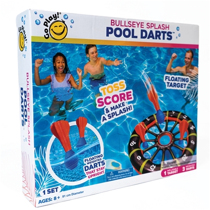 Bullseye Splash Pool Darts are designed to be safe and soft. The rubbery tipped darts stay upright and won’t sink, making it easy to keep track of the points scored.