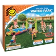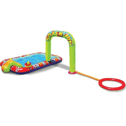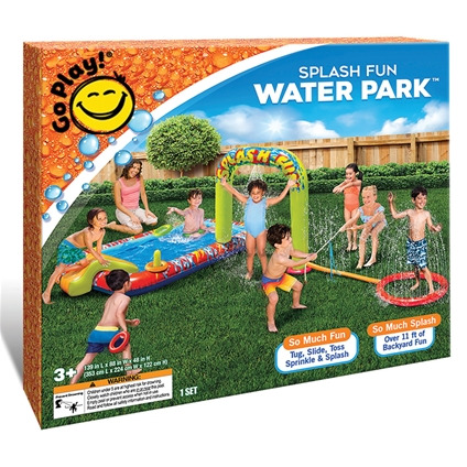 Dive into summer with this fun inflatable water park for kids. The Splash Fun Water Park is the ultimate backyard party. This fun water park has a waterfall arch, a splash pool with slide, a sprinkler ring and a tug-of-war activity. Jump into the play pool and play the ring toss game. Slide down the removable slide. Attach a hose and you can race through the waterfall arch and sprinklers too. Product size: 353L x 224W x 122H cm. Ages 3+.